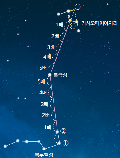 북두칠성의 국자 머리 부분의 두 별을 이어 그 간격의 약 다섯 배 떨어진 곳을 찾으면 북극성이 위치하고 있습니다.